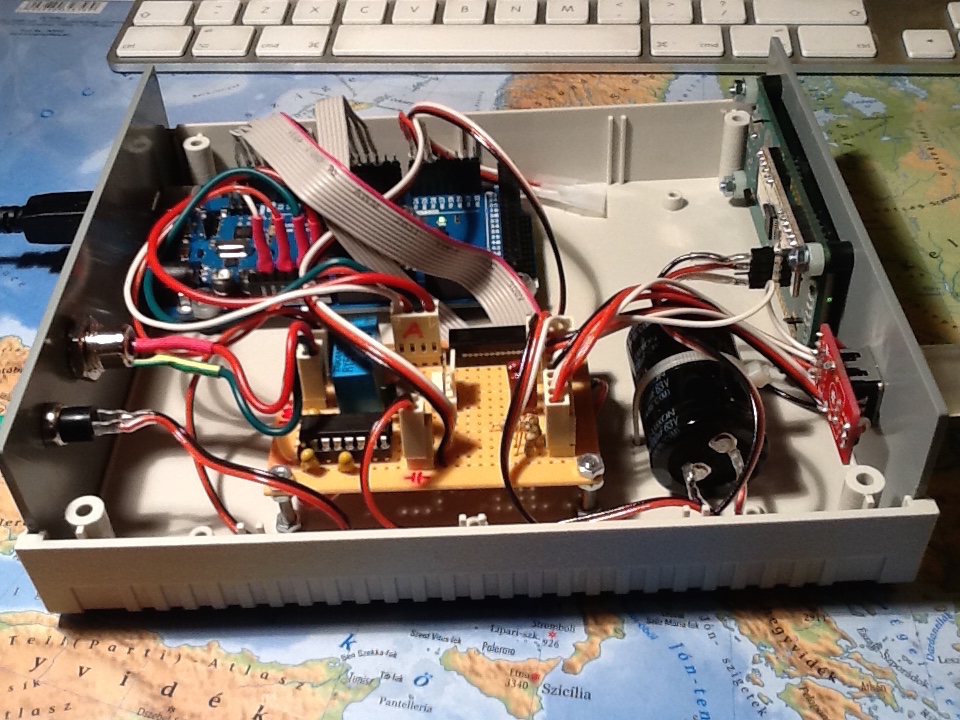 Ebben a nezetben jobban lathato a doboz belseje, Arduino MEGA, seged aramkorok, LCD display, es bar nem nagyon latszik, de az elolapon van egy tobb funkcios encoder.