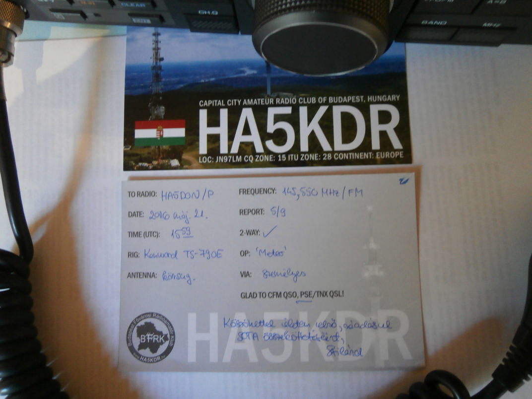 A mai tanfolyami napon délután forgalmazási gyakorlatot tartottunk. A 2 méteres sávban FM üzemmódban az S-22 csatornán a hallgatók épp gyártották az összeköttetéseket ha7eo Attilával amikor az egyik rövid szünetben berobbant egy QRX. Ha5don/p István SOTA aktiváción volt éppen a HA/KM-018, Nagy-Kevély csúcson. Szilárd tanuló operátorunknak elsőre kicsit sok volt az információ de szépen letisztáztunk mindent hogy mik ezek a nem várt adatok. Őrült is neki hiszen első rádióamatőr forgalmazásán már egyből egy SOTA összeköttetést sikerült megejtenie. Szilárd gyorsan ki is töltött egy QSL lapot, ami itt várja a klubban ha5don Istvánt.